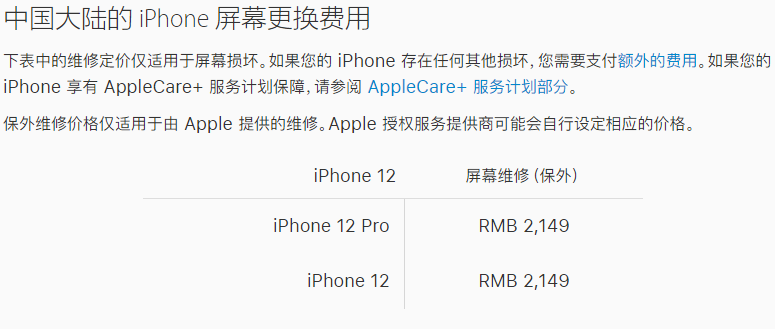 此外也可以通过购买AppleCare + 服务来延长保修时间,但其价格同样不菲。其中iPhone 12 和 iPhone 12 mini的AppleCare +服务售价为1398元,而iPhone 12 Pro和iPhone 12 Pro Max的AppleCare +服务售价为1798元。